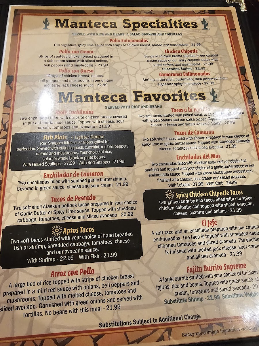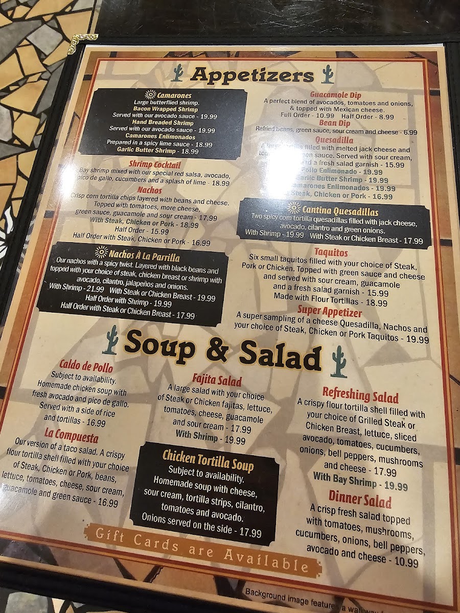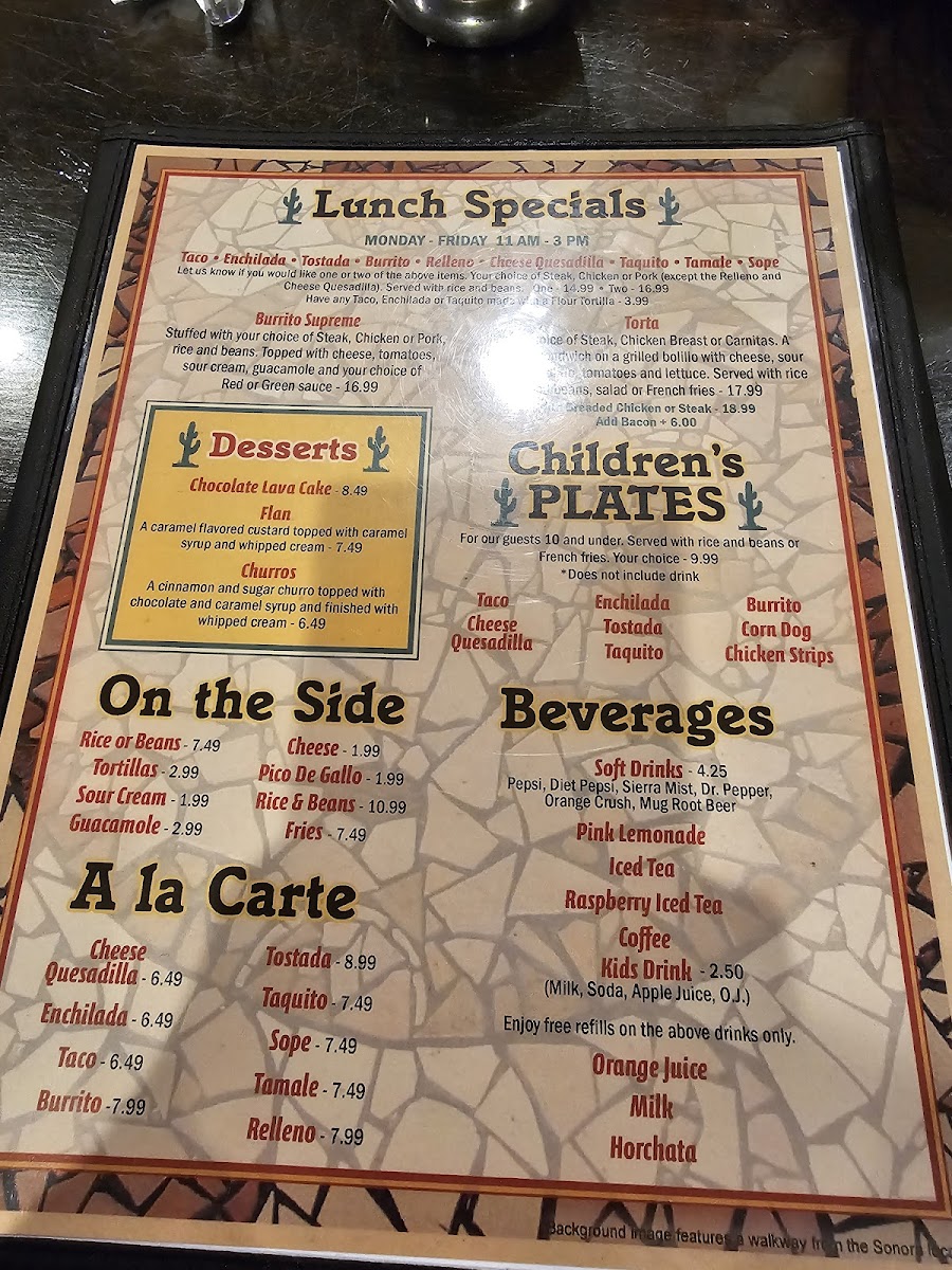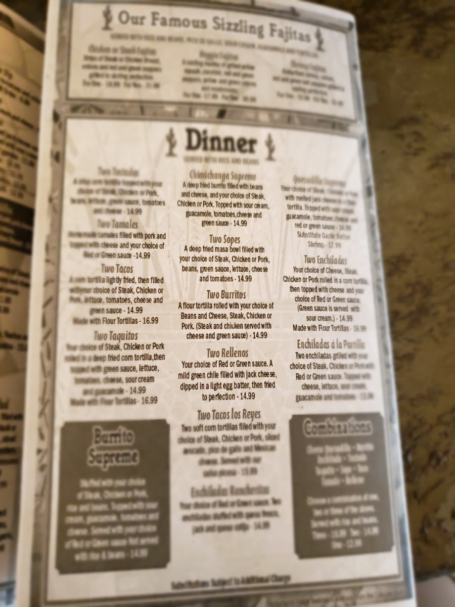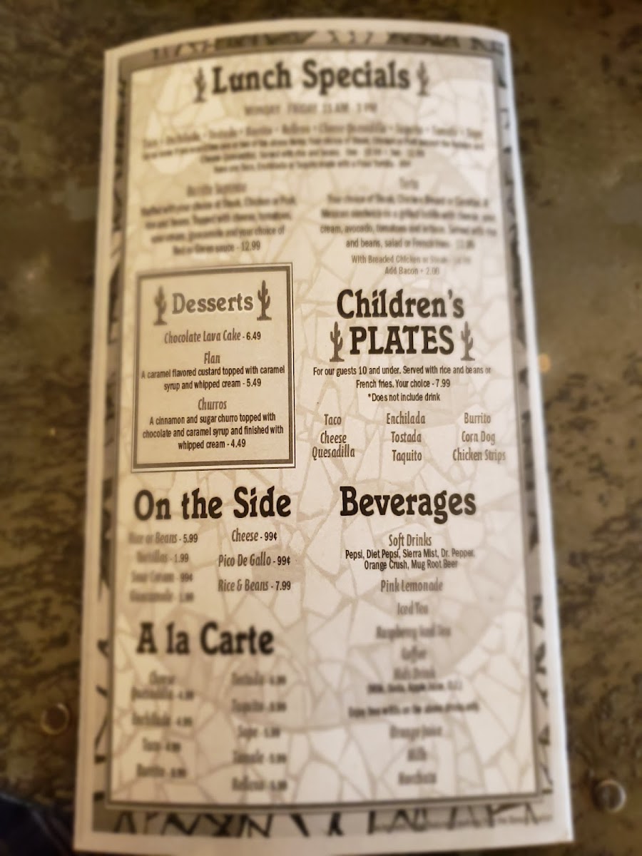 You’ll find classic plates like enchiladas Mexicali style and chicken fajitas alongside house specialties such as the Chile Colorado and Steak Á La Mexicana. For those who appreciate a fresh twist, the menu also includes gluten-free options like their signature margarita and unique beverages such as prickly pear lemonade or an electric lemonade to refresh the palate.